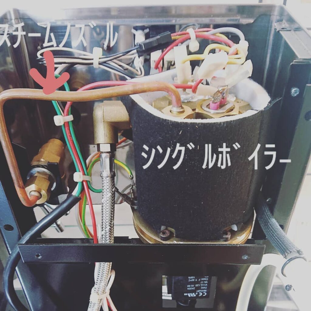 銀色のケースを空けてみると、非常にシンプルな構造でした。Silviaは、シングルボイラー(スチームと抽出が同じ機構を使う)です。スチームノズルは、正面のバルブを回すとボイラー上部の蒸気圧が銅管を通ってスチームを行います。